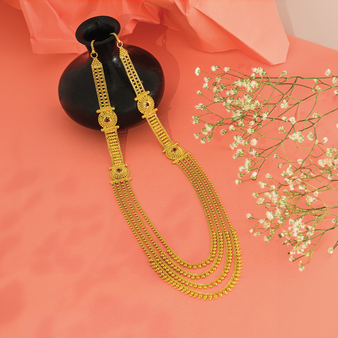 An exquisite cascade of pure gold, this 22-carat necklace is crafted with intricate patterns, offering a perfect balance of tradition and opulence for a truly majestic look.