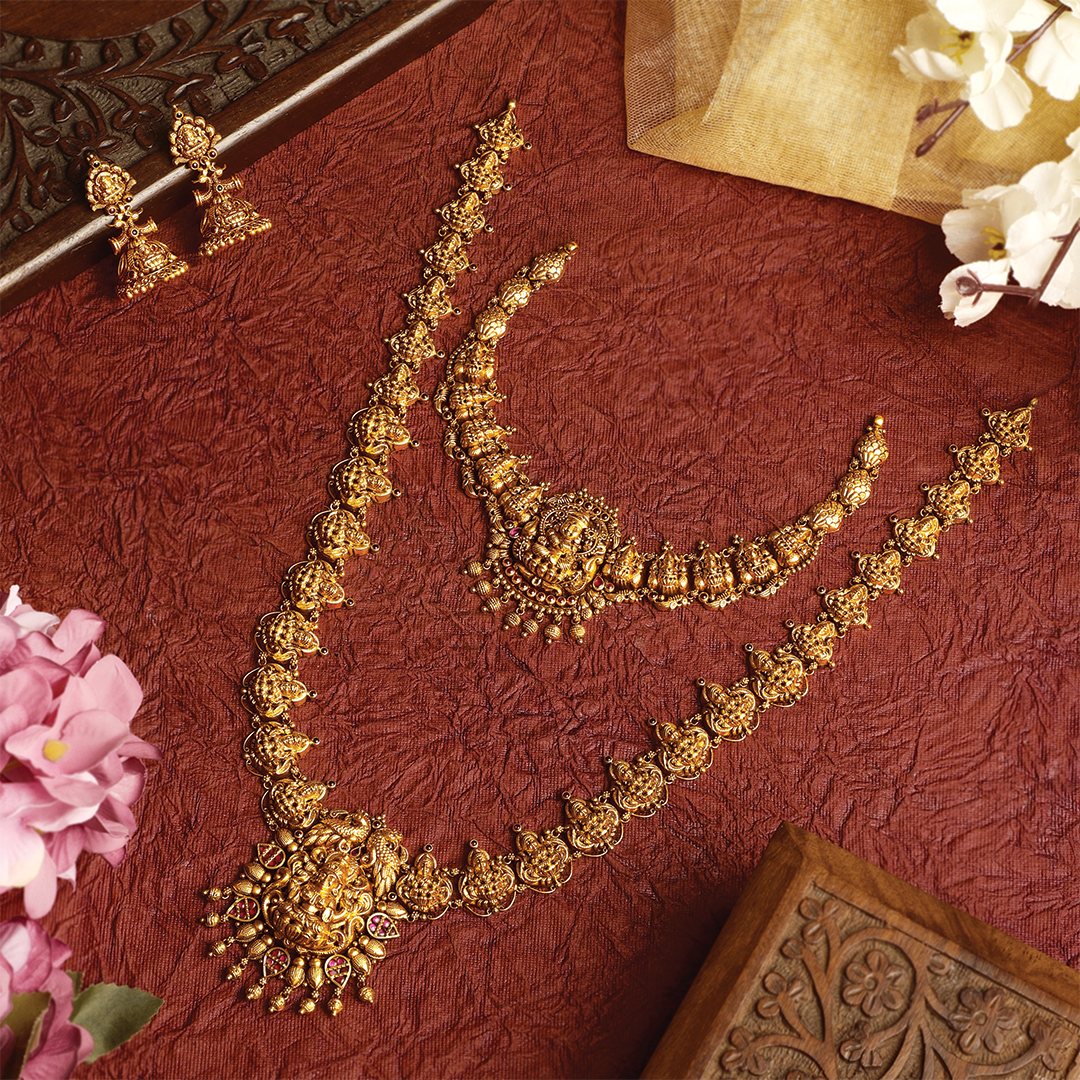 The SwarnaRatna Necklace is a luxurious piece, intricately designed with radiant gold and precious gemstones. It symbolizes wealth, elegance, and timeless beauty.